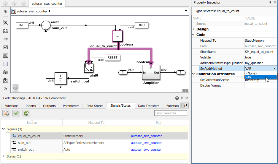 {'/Company/Powertrain/DataTypes/SwAddrMethods/myVAR'}SwAddrMethod с данными модели или функциейСвязаться SwAddrMethods с данными и функциями модели, откройте редактор Сопоставления кодов (Code Mappings) и выберите вкладку Параметры (Parameters), Хранилища данных (Data Stores), Сигналы/состояния (Signals/States) или Функции (Functions). Выберите элемент на этой вкладке и с помощью инспектора свойств задайте атрибут SwAddrMethod. В этом примере: SwAddrMethod Для сигнала выбран VAR equal_to_count, которая отображается в статическую память AUTOSAR.