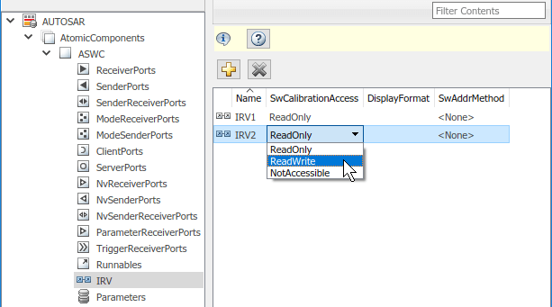 Кроме того, можно использовать функции свойств AUTOSAR для определения SwCalibrationAccess для элементов данных AUTOSAR. Например, следующий код открывает autosar_swc_fcncalls пример модели и устанавливает доступ измерений и калибровки к межпробегающим переменным IRV2 ReadWrite.