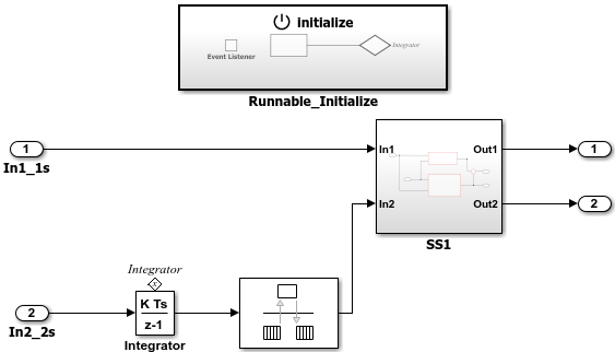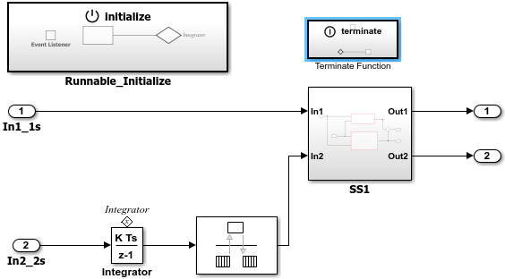 Блоки Initialize Function и Terminate Function могут управлять выполнением компонента в ответ на события инициализации, сброса или завершения. Дополнительные сведения см. в разделах Использование функций инициализации, сброса и завершения, Создание кода, отвечающего на события инициализации, сброса и завершения (Simulink Coder), и AUTOSAR раздел Запуск, сброс и завершение работы.