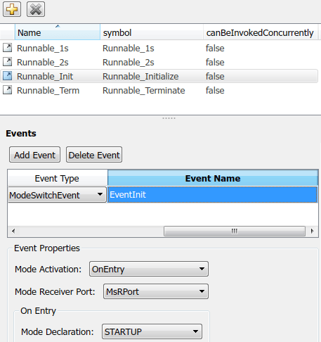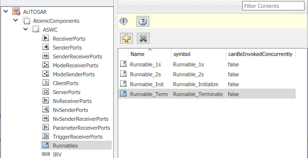 Список runnables уже содержит запускаемую инициализацию, созданную как часть начального представления Simulink программного компонента AUTOSAR. С помощью кнопки «Добавить