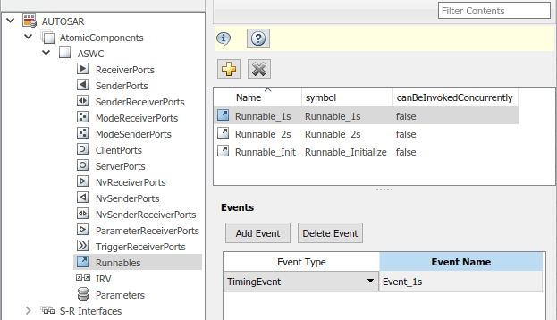 В модели autosar_swc, периодическое выполнение Runnable_1s активируется TimingEvent названный Event_1s.