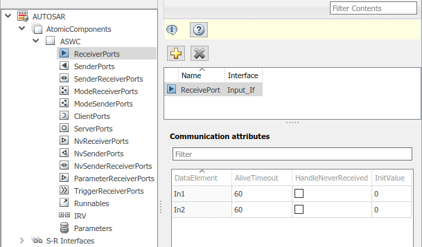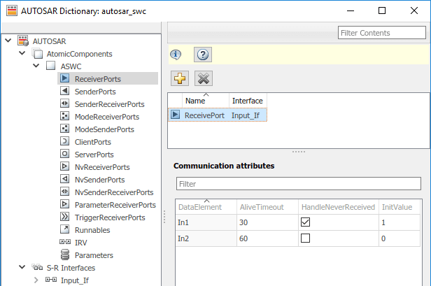 При импорте или создании порта приемника AUTOSAR можно использовать словарь AUTOSAR для просмотра и редактирования атрибутов ComSpec сопоставленных элементов данных S-R в порту AUTOSAR.