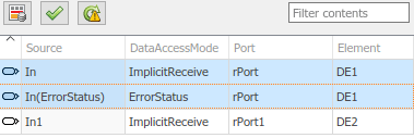 Откройте редактор сопоставлений кода. Выберите вкладку Inports. Выберите порт ввода данных, сопоставленный порту-получателю AUTOSAR, для которого требуется настроить DataReceiveErrorEvent. Установите режим доступа к данным AUTOSAR в значение ImplicitReceive, ExplicitReceive, или EndToEndRead. Вот два примера, без и с связанным портом ErrorStatus.