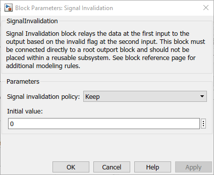 Просмотрите параметры блока «Недействительность сигнала», например, в инспекторе свойств или диалоговом окне параметров блока. Проверьте политику аннулирования сигнала и атрибуты начального значения. Дополнительные сведения см. на странице ссылки на блок недействительности сигнала.