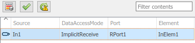 Вход Simulink с именем In1 сопоставлен с портом-приемником AUTOSAR RPort1 и элемент данных InElem1. В словаре AUTOSAR порт приемника AUTOSAR RPort1 выбирает интерфейс S-R In1, который содержит элемент данных InElem1. В редакторе сопоставлений кодов на вкладке «Inports» (Ввод данных) отображается сопоставление для ввода данных. In1.