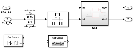 Откройте модель, настроенную для генерации кода AUTOSAR. С помощью обозревателя библиотек или путем ввода имен блоков в окне модели добавьте в модель блоки Dem. В этом примере блоки DiagnosticInfoCaller и DiagnosticMoneyCaller добавляются к копии примера модели с возможностью записи. autosar_swc.