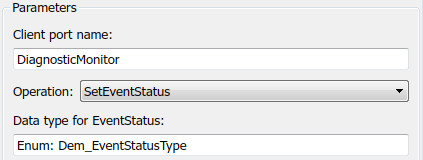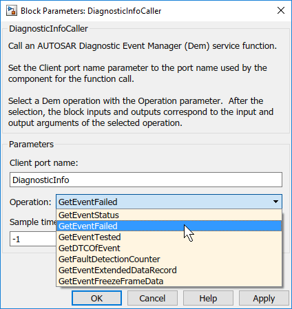 Для некоторых операций Dem, таких как GetDTCOfEvent и SetEventStatusв диалоговом окне параметров блока отображается параметр типа данных. Параметр указывает перечисляемый тип данных для ввода функции, который представляет тип формата Dem или состояние события. Предоставляются типы данных по умолчанию, такие как Dem_DTCFormatType или Dem_EventStatusType. Дополнительные сведения о типе формата или значениях состояния события см. в стандартной спецификации AUTOSAR диспетчера диагностических событий.