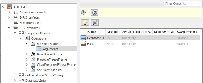 Программное обеспечение создает интерфейс C-S DiagnosticMonitor, и ниже DiagnosticMonitor, его поддерживаемые операции. Для каждой операции аргументам предоставляются свойства только для чтения. Вот аргументы для DiagnosticMonitor операция SetEventStatus отображается в словаре AUTOSAR.