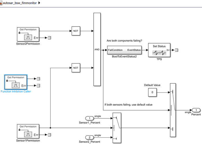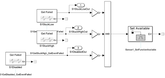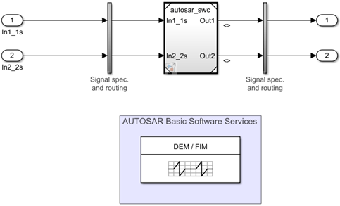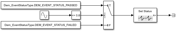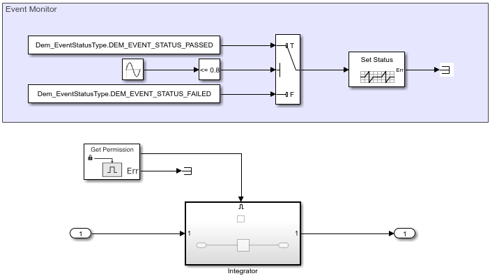 Рассмотрим модель программного компонента AUTOSAR, в которой блок состояния набора Dem служит в качестве монитора для новых функциональных возможностей компонента. События Dem, передаваемые с помощью блока Set Status, указывают на наличие таких условий, как отказ датчика. Состояние события определяет, может ли выполняться выполнение связанных нисходящих функций. Функции выполняются только в том случае, если события отказа не сообщаются.