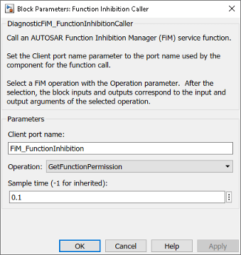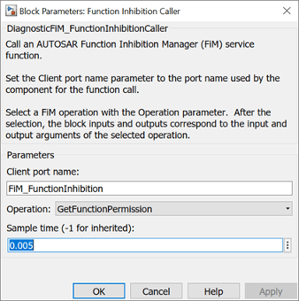 Откройте новый блок и проверьте параметры. Для вызова службы FiM именем порта клиента является FiM_FunctionInhibition и Операция GetFunctionPermission. Установить время выборки на 0.005, который совпадает с другим GetFunctionPermission блоки вызывающего абонента в модели.