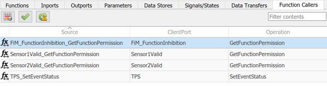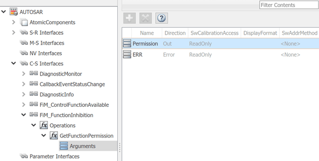 Программное обеспечение создает интерфейс C-S FiM_FunctionInhibition, и ниже FiM_FunctionInhibition, его поддерживаемая работа, GetFunctionPermission. Аргументы операции имеют свойства, доступные только для чтения. В словаре AUTOSAR приведены аргументы для FiM_FunctionInhibition операция GetFunctionPermission.
