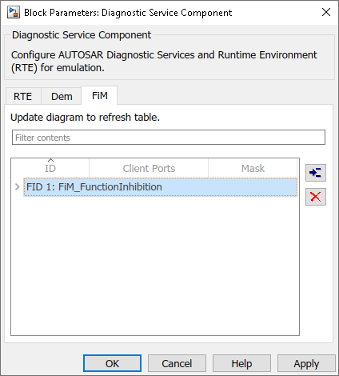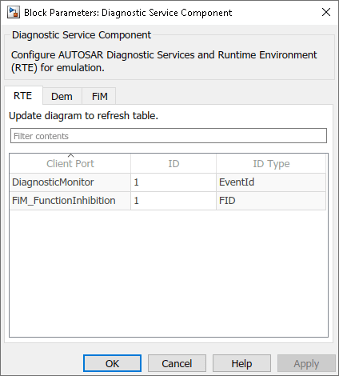 Откройте диалоговое окно «Блок компонента службы диагностики». Чтобы обновить таблицы RTE и FiM в диалоговом окне в любой точке, обновите модель.