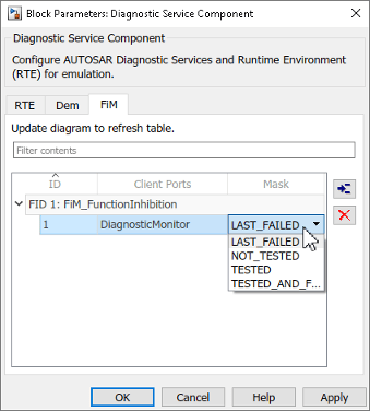 AUTOSAR Blockset предоставляет блоки FiM и Dem, которые позволяют запрашивать состояние условий ингибирования функции и настраивать критерии ингибирования функции на основе состояния диагностического события.