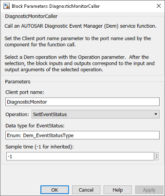 Библиотека блоков базового программного обеспечения AUTOSAR предоставляет блок компонента службы диагностики, который обеспечивает эталонные реализации операций службы Dem и FiM. Можно вручную вставить блок в содержащую его модель композиции, системы или электрического жгута или автоматически вставить блок, создав модель электрического жгута Simulink Test™.