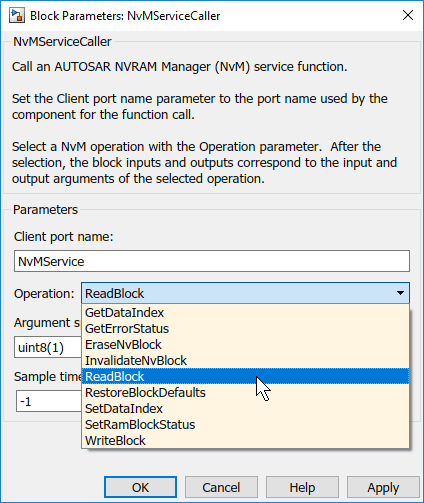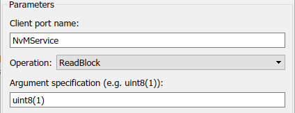 Для некоторых операций NvM, таких как ReadBlock и WriteBlockв диалоговом окне параметров блока отображается параметр спецификации аргумента. Параметр определяет тип данных и информацию об измерении для данных, которые будут считаны или записаны операцией, значение uint8(1) по умолчанию.