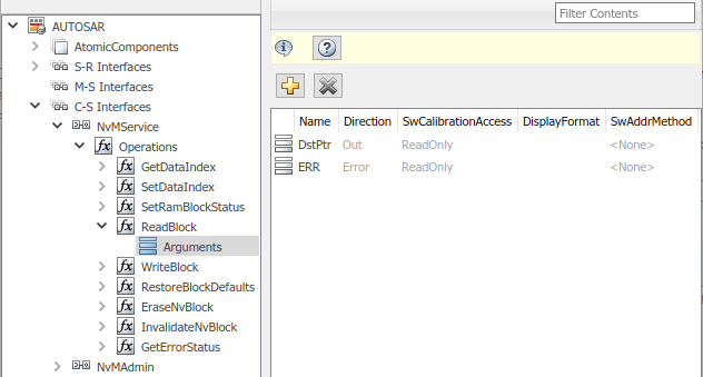 Программное обеспечение создает интерфейс C-S NvMService, и ниже NvMService, его поддерживаемые операции. Для каждой операции аргументам предоставляются свойства только для чтения. Вот аргументы для NvMService операция ReadBlock отображается в словаре AUTOSAR.