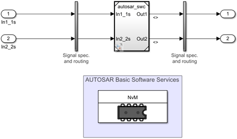Откройте модель, настроенную для генерации кода AUTOSAR. С помощью обозревателя библиотек или путем ввода имен блоков в окне модели добавьте в модель блоки NvM. В этом примере блоки NvMAdminCaller и NvMServiceCaller добавляются к копии примера модели с возможностью записи. autosar_swc.