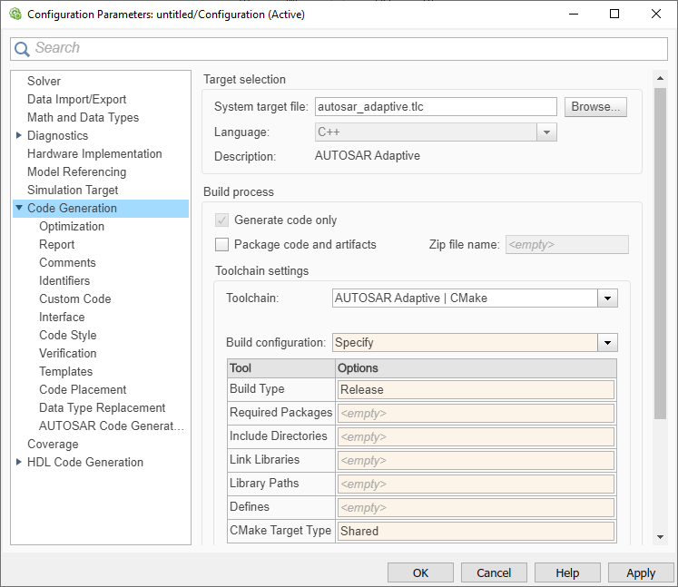 В рамках создания кода для адаптивной модели AUTOSAR можно создать CMakeLists.txt для создания статической или общей библиотеки или исполняемого файла. AUTOSAR Adaptive | CMake инструментальная цепочка генерирует CMakeLists.txt файл, следующий за модульными шаблонами CMake. Можно связать результирующую библиотеку с main.cpp или объединить его с другими файлами модели в среде интеграции.