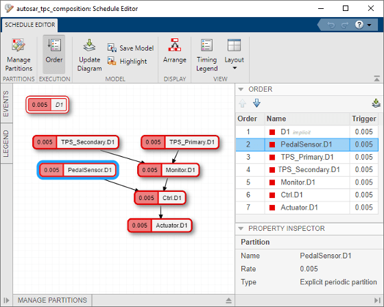 В архитектурной модели AUTOSAR для открытия редактора спецификаций откройте вкладку «Моделирование» и выберите «Инструменты проектирования» > «Редактор спецификаций». Редактор отображает все выполняемые компоненты в каждом компоненте иерархии композиции. Вот представление порядка выполнения при открытии редактора расписания из модели архитектуры примера. autosar_tpc_composition. Используйте элементы управления редактора для изменения порядка выполнения исполняемых таблиц.