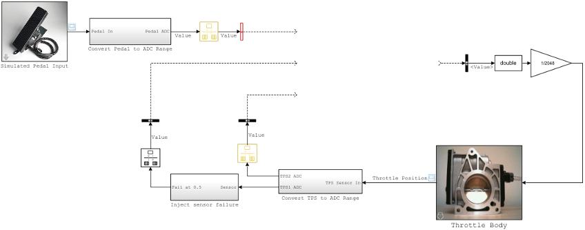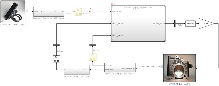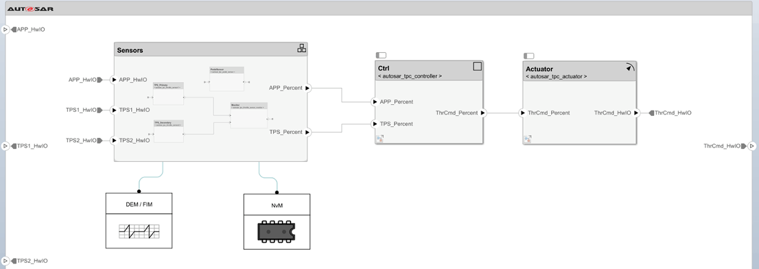 Вот тестовая модель электрического жгута для моделирования архитектурной модели autosar_tpc_composition. Тестовый жгут содержит модель установки с блоком ввода педали и сигналы, соответствующие модели архитектуры, которые требуют и обеспечивают порты. Эта модель была адаптирована из примера модели autosar_tpc_system.