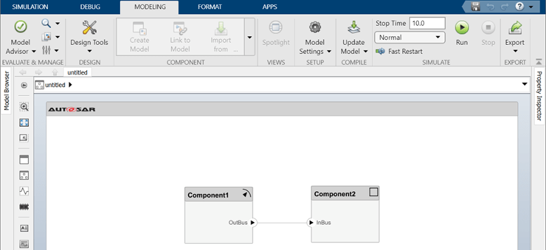 Чтобы начать разработку композиций и компонентов AUTOSAR в холсте архитектуры программного обеспечения, создайте архитектурную модель AUTOSAR (требуется System Composer™).