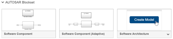 На вкладке Создать (New) прокрутите список шаблонов модели до элемента Блок AUTOSAR (AUTOSAR Blockset). Наведите курсор на шаблон архитектуры программного обеспечения и щелкните Создать модель (Create Model).