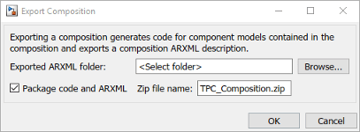 Чтобы экспортировать архитектурную модель, на вкладке Моделирование выберите Экспорт > Создать код и ARXML. В диалоговом окне «Экспорт композиции» укажите имя ZIP-файла, в который будут упакованы созданные файлы. При необходимости укажите путь к папке для размещения экспортированных файлов ARXML. Чтобы начать экспорт, нажмите кнопку ОК.