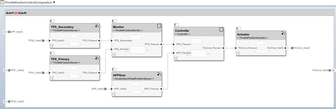 % Create AUTOSAR architecture model modelName = "myArchModel"; archModel = autosar.arch.createModel(modelName); % Import composition from file ThrottlePositionControlComposition.arxml importerObj = arxml.importer("ThrottlePositionControlComposition.arxml"); % Parse ARXML importFromARXML(archModel,importerObj,... "/Company/Components/ThrottlePositionControlComposition");