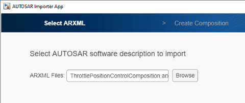 В этом примере введите ThrottlePositionControlComposition.arxml. Файл ARXML находится в , который находится в пути поиска MATLAB по умолчанию.matlabroot/examples/autosarblockset/data