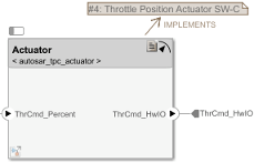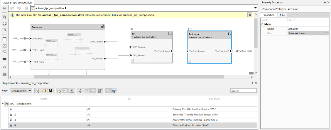 Чтобы связать требование с компонентом AUTOSAR, перетащите его из Обозревателя требований в блок компонента. Например, перетащите требование 4 в Actuator компонентный блок.