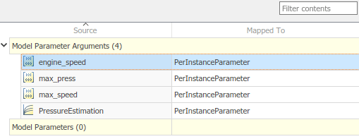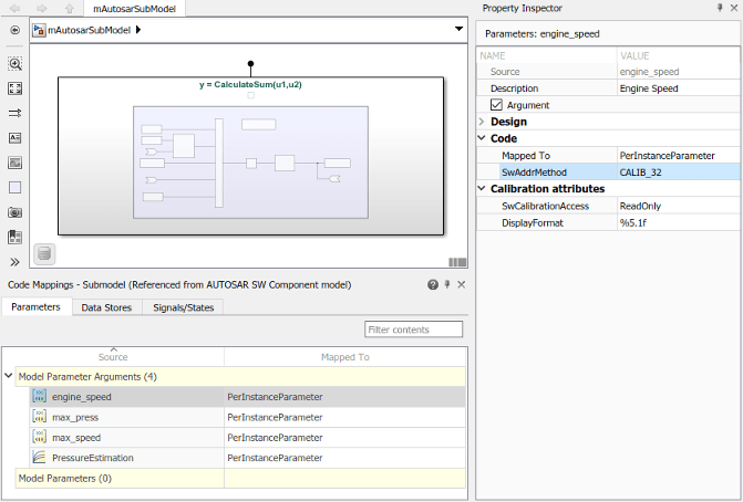 updateModel(ar,hModel);На вкладке Параметры (Parameters) редактора Сопоставления кодов (Code Mappings) можно сопоставить параметры подмодели Simulink с параметрами AUTOSAR каждого экземпляра для калибровки во время выполнения AUTOSAR. Примеры параметров рабочей области модели, которые можно сопоставить, включают: