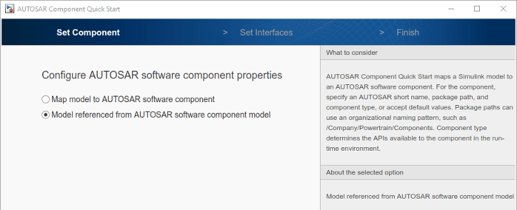 Если подмодель не сопоставлена, открывается окно быстрого запуска компонента AUTOSAR (AUTOSAR Component Quick Start). Проработать процедуру быстрого запуска. На панели Задать компонент (Set Component) выберите Модель (Model), на которую ссылается модель компонента программного обеспечения AUTOSAR