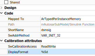| DisplayFormat | Укажите формат отображения переменной AUTOSAR. Спецификации формата отображения AUTOSAR управляют шириной и точностью отображения данных измерений и калибровки. Дополнительные сведения см. в разделе Настройка DisplayFormat. |
