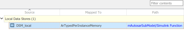 На вкладке Хранилища данных (Data Stores) редактора Сопоставления кодов (Code Mappings) можно сопоставить блоки памяти хранилища данных подмодели Simulink с элементами памяти, набранными в экземпляре AUTOSAR, для калибровки во время выполнения AUTOSAR.