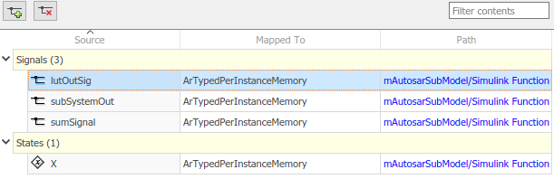 На вкладке «Signals/States» редактора «Code Mappings» можно сопоставить сигналы и состояния блоков подмодели Simulink с элементами памяти, типизированными по типу AUTOSAR, для калибровки во время выполнения AUTOSAR.