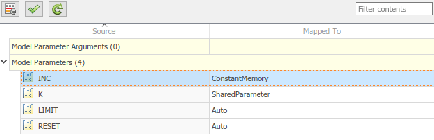 После создания параметров рабочего пространства модели, например, с помощью Проводника моделей, откройте редактор Сопоставления кодов (Code Mappings) и перейдите на вкладку Параметры (Parameters). Выберите параметры рабочего пространства модели Simulink и сопоставьте их с: