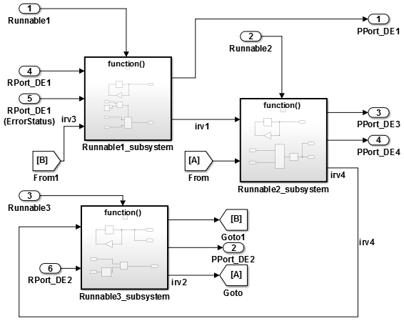 В AUTOSAR для передачи данных между исполняемыми объектами в одном и том же компоненте используются переменные с возможностью взаимодействия. Эти переменные в модели Simulink определяются сигнальными линиями, соединяющими подсистемы (выполняемые). Например, на следующем рисунке: irv1, irv2, irv3, и irv4 являются переменными, выполняемыми между собой.