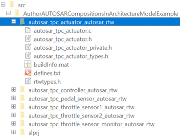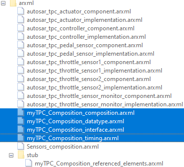 Осмотрите arxml папка. Каждый компонент AUTOSAR имеет файлы описания компонентов и реализации, в то время как модель архитектуры имеет файлы описания состава, типа данных, интерфейса и времени. Файл композиции содержит XML-описания композиции, прототипов компонентов, портов и соединителей композиции. Типы данных, интерфейсы и файлы синхронизации объединяют элементы из всей иерархии архитектурных моделей.
