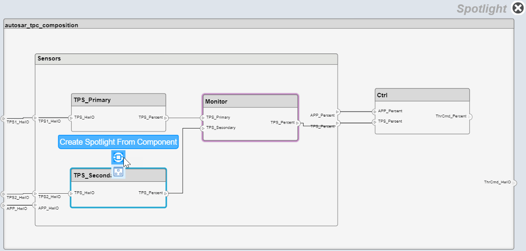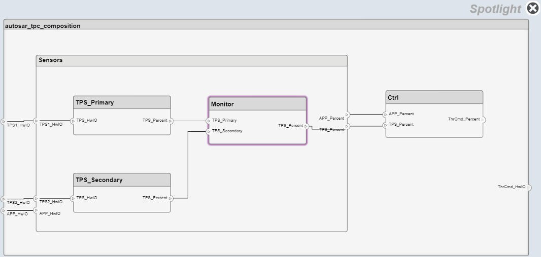 В виде прожектора отображаются элементы модели, с которыми компонент или композиция соединяется в иерархии. Макет диаграммы прожектора изменить нельзя. На этом рисунке показан вид компонента в центре внимания Monitor в примере модели AUTOSAR autosar_tpc_composition. (Чтобы открыть пример модели в локальной рабочей папке, используйте команду openExample('autosar_tpc_composition').)
