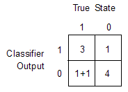 Диагностическая таблица, заданная в виде числового массива «два на два». Первая строка указывает число выборок, классифицированных как положительные, с числом истинных положительных результатов в первом столбце и числом ложных положительных результатов во втором столбце. Вторая строка указывает количество образцов, классифицированных как отрицательные, с числом ложных негативов в первом столбце и числом истинных негативов во втором столбце.