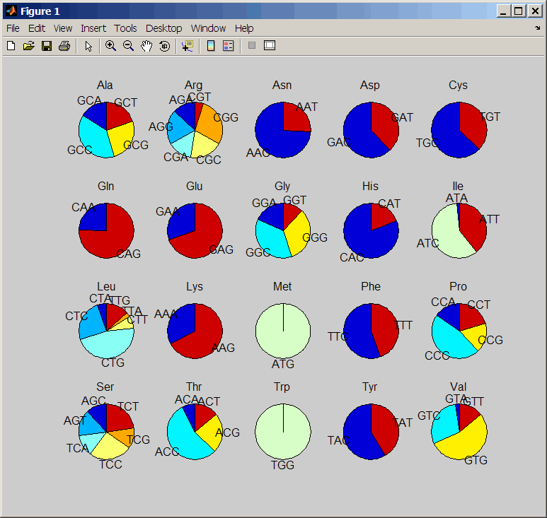 контролирует создание фигуры в 20 круговых диаграмм, по одной на каждую аминокислоту. Варианты: CodonFreq = codonbias(SeqNT, ...'Pie', PieValue, ...)true или false (по умолчанию).