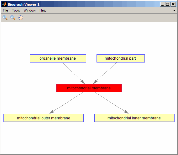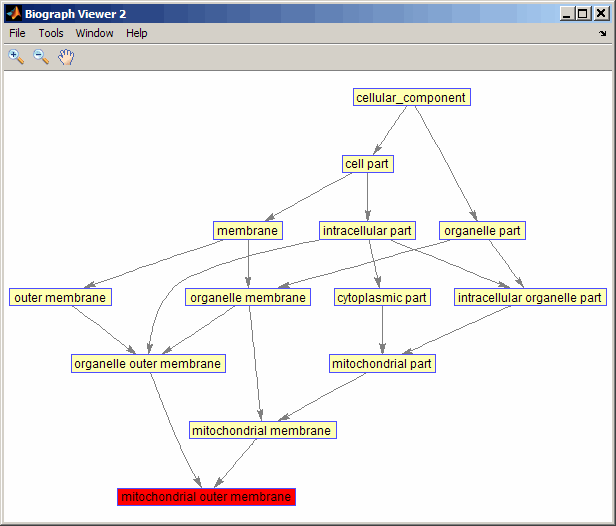 [cm acc rels] = getmatrix(subontology); BG = biograph(cm, get(subontology.terms, 'name')); BG.nodes(acc==5741).Color = [1 0 0]; view(BG)