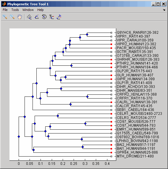 tr = phytreeread('pf00002.tree');Определение всех белков мыши и человека путем поиска узлов, включающих векторы символов 'mouse' и 'human' в их именах.