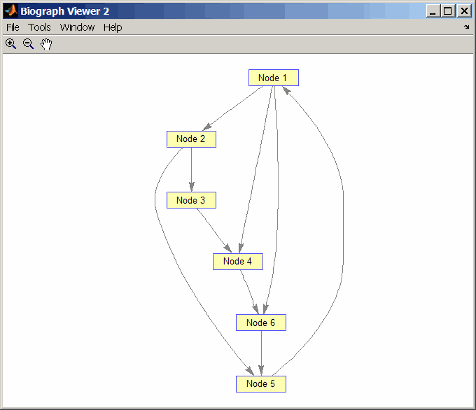 DG = sparse([1 1 1 2 2 3 4 6],[2 4 6 3 5 4 6 5],true,6,6) DG = (1,2) 1 (2,3) 1 (1,4) 1 (3,4) 1 (2,5) 1 (6,5) 1 (1,6) 1 (4,6) 1 view(biograph(DG))
