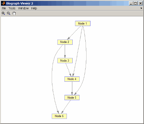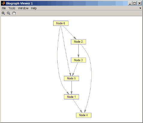 DG = sparse([6 6 6 2 2 3 5 1],[2 5 1 3 4 5 1 4],true,6,6) DG = (5,1) 1 (6,1) 1 (6,2) 1 (2,3) 1 (1,4) 1 (2,4) 1 (3,5) 1 (6,5) 1 view(biograph(DG))