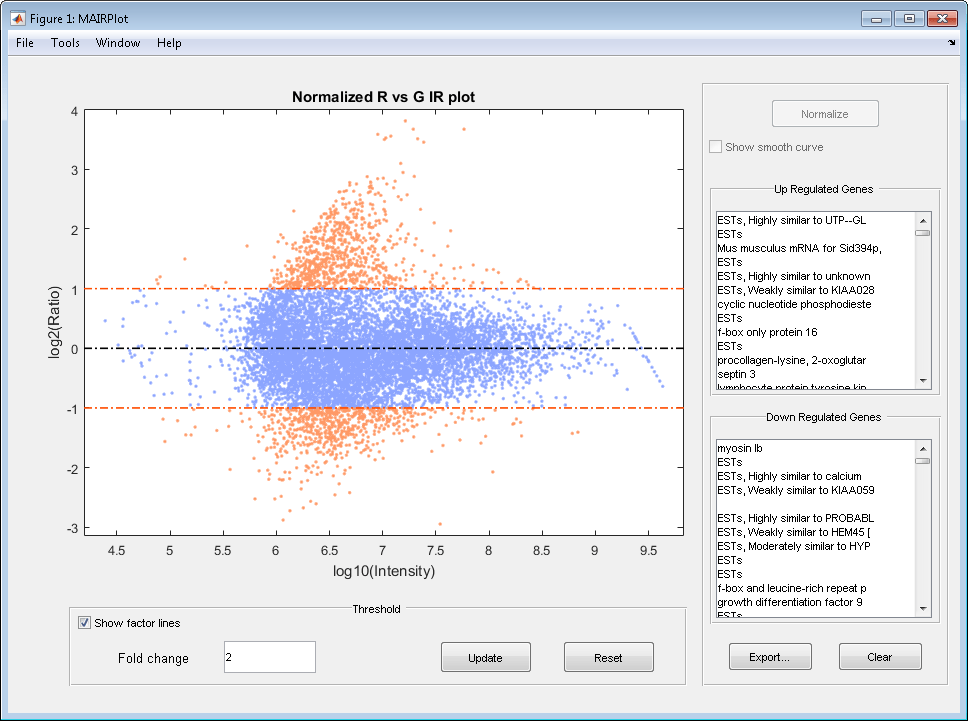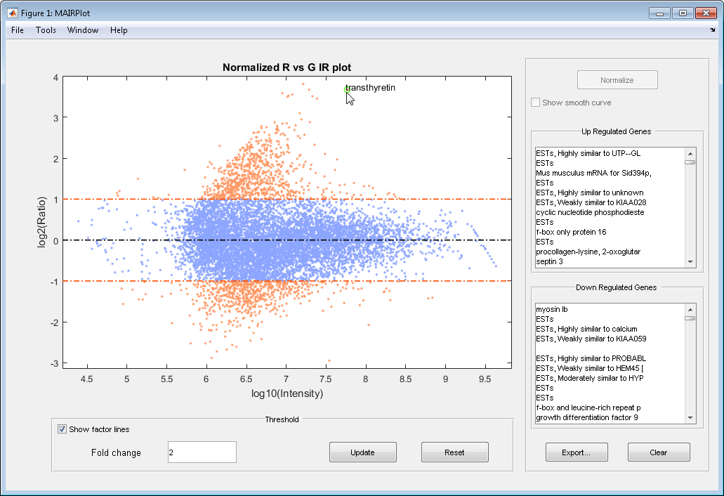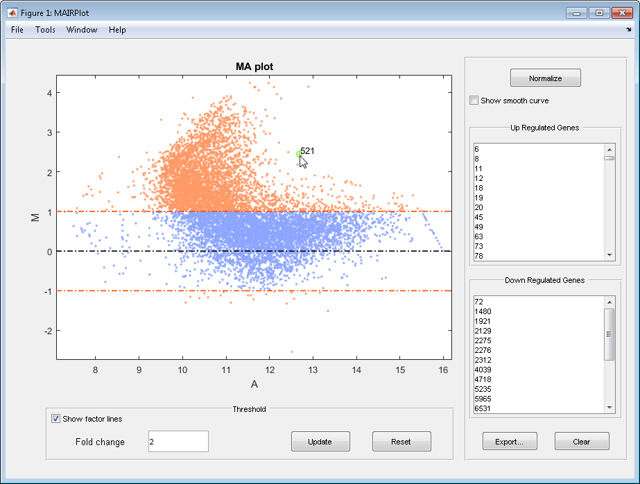 Просмотрите списки значительно повышенных и пониженных генов и при необходимости экспортируйте метки и индексы генов в структуру в рабочей области MATLAB ®, нажав кнопку Экспорт.