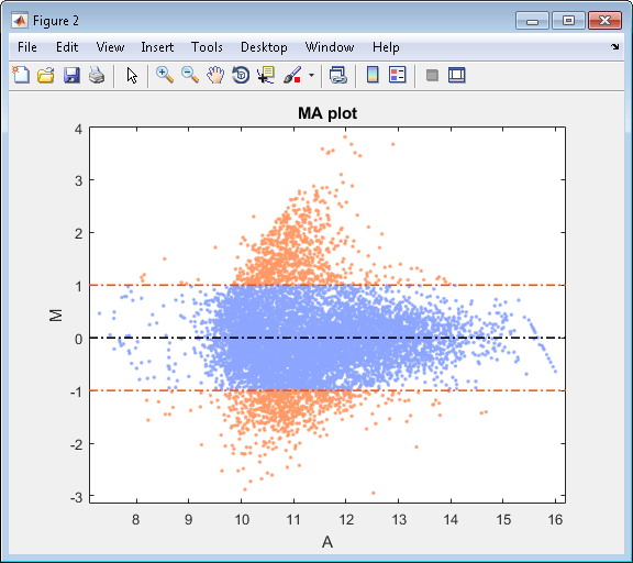 mairplot(cy5data, cy3data, 'Normalize', true, ... 'Type','MA','PlotOnly',true)