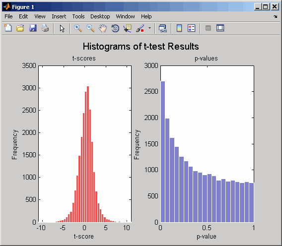 [pvalues,tscores] = mattest(dependentData,independentData,... 'permute',true,'showhist',true,... 'showplot',true);
