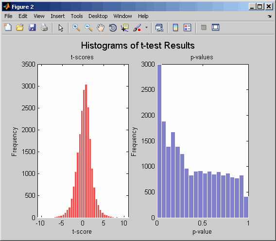 [pvalues,tscores] = mattest(dependentData,independentData,... 'bootstrap',2000,'showhist',true,... 'showplot',true);