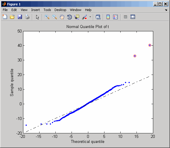 ... = mattest(..., 'Showplot', управляет отображением нормального графика квантиля t-score. Когда ShowplotValue, ...)ShowplotValue является true, mattest отображает квантиль-квантильный график. По умолчанию: false. На графике квантиля t-score черная диагональная линия представляет квантиль выборки, равный теоретическому квантилю. Точки данных генов, которые считаются дифференциально экспрессированными, находятся дальше от этой линии. В частности, точки данных с t-оценками > (1 - 1/(2N)) или < 1/(2N) отображение красными кругами. N - общее количество генов.